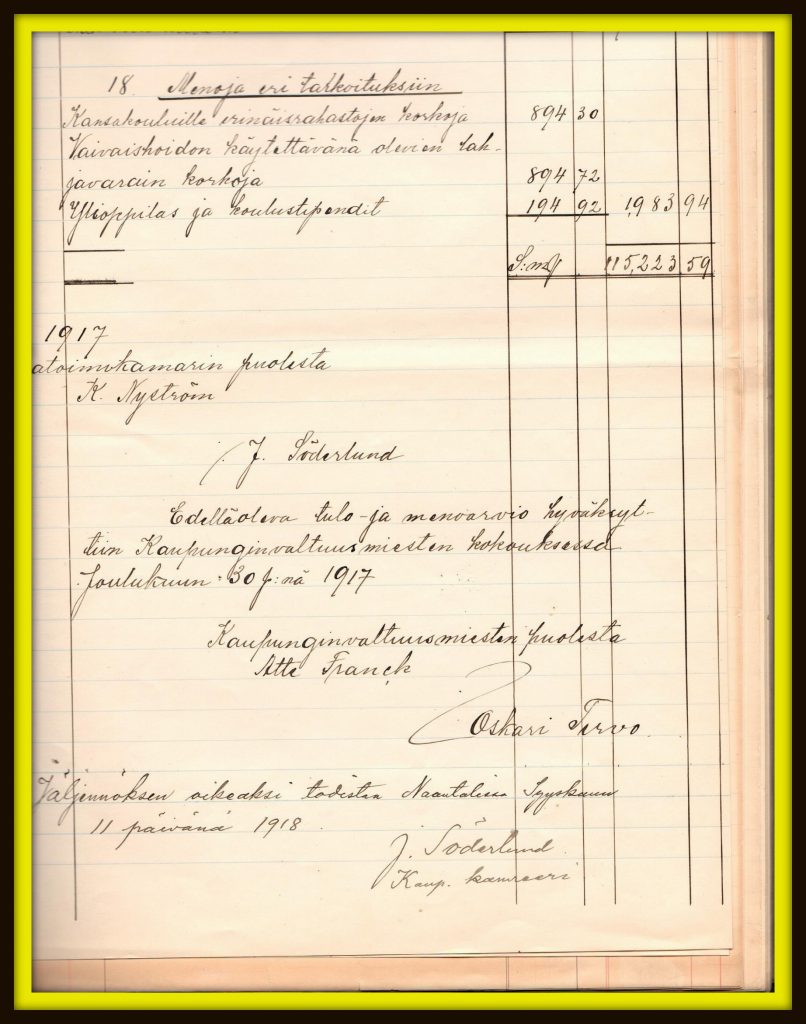 Kaupunkiliitolle toimitetun kopion viimeisellä sivulta selvisi, että valtuusmiehet olivat asiasta päättäneet joulukuun 30 pnä 1917 budjetin loppusumman olessa 115 223 markaa.