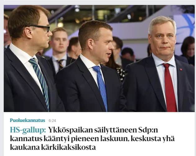 Hesarin otsikkoon saadaan SDP:n notkahdus alle 22 prosentin, keskusta pelkää jäävänsä kahden kisan ulkokehälle ja haluaa matkia persuja opposition punavihreyden korostamisella.