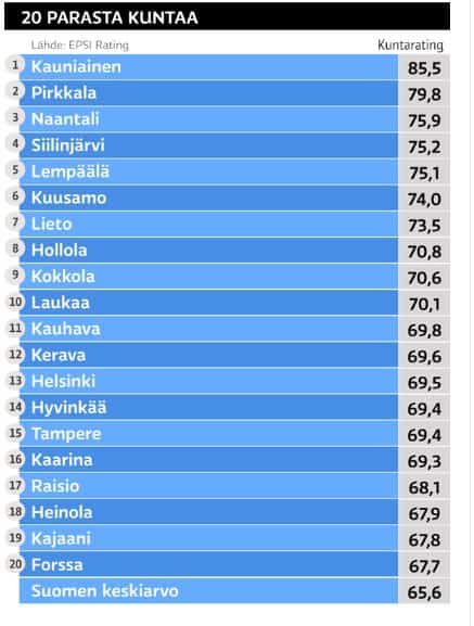 Yle uutisoi ja TS:n verkkosivut jatkoivat ihan kuin tilauksesta palveluihin tyytyväisyyttä eri kunnissa . Naantalin menestynyt näissä hyvin ja niinpä näyttää olevan, että menestyneiden ja Henna Virkkusen pakkoliitoskuntien lista on lähes identtinen erityisesti Turun ja Tampereen seuduilla. Vertaa edellisen ajankohtaisjutun kuvaa ja listaa.