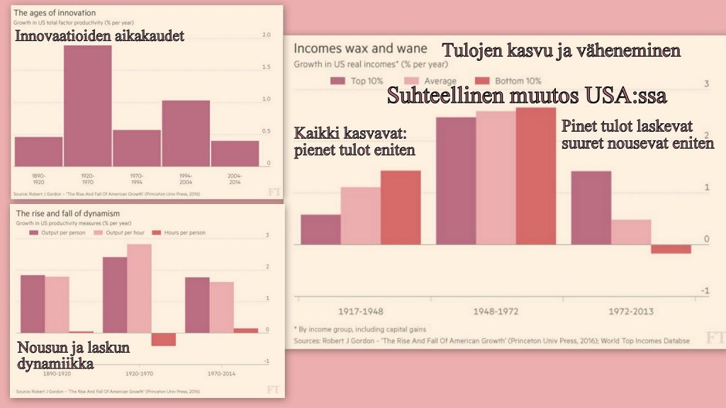 pettymyksen aikakautta, sillä tekniset läpimurrot ovat suhteellisen vähäisiä.Tuottavuuden kasvun selitys löytyy innovaatioista. Prof Gordon selittää, että erilaisia innovaatioita,