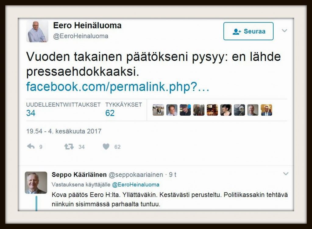 Ps. Uutisten Erkki Tuomioja ehdottaa Sauli Niinistön taakse