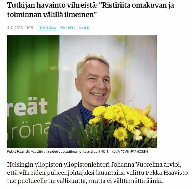 julkaisemassa STT:n haastattelussa, että tämä näyttää ulospäin ”aika erikoiselta”.”Kokenut nainen ei saanut puolueen sisällä lainkaan