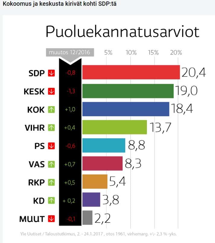Mutta ei sille mitään voi, että otsikot voivat olla mitä vain julkisessakin tiedotusvälineessä, kuten oheinen kuva kertoo; Kokoomus ja Keskusta kirivät kohti SDP:tä. Kannatus muutos: Keskusta -1,3, SDP -0,8, Kok +1,0.