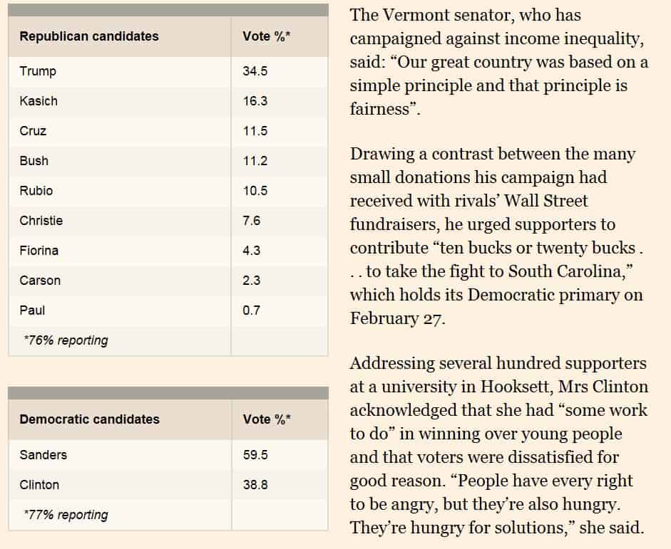 New Hampshiren tulo oli ennusteita selkeämpi. Pitääkö Donald Trump ottaa tosissaan ja onko Bernie Sandersilla todellisia mahdollisuuksia? Näitä asioita pohdiskellaan FT:ssä.