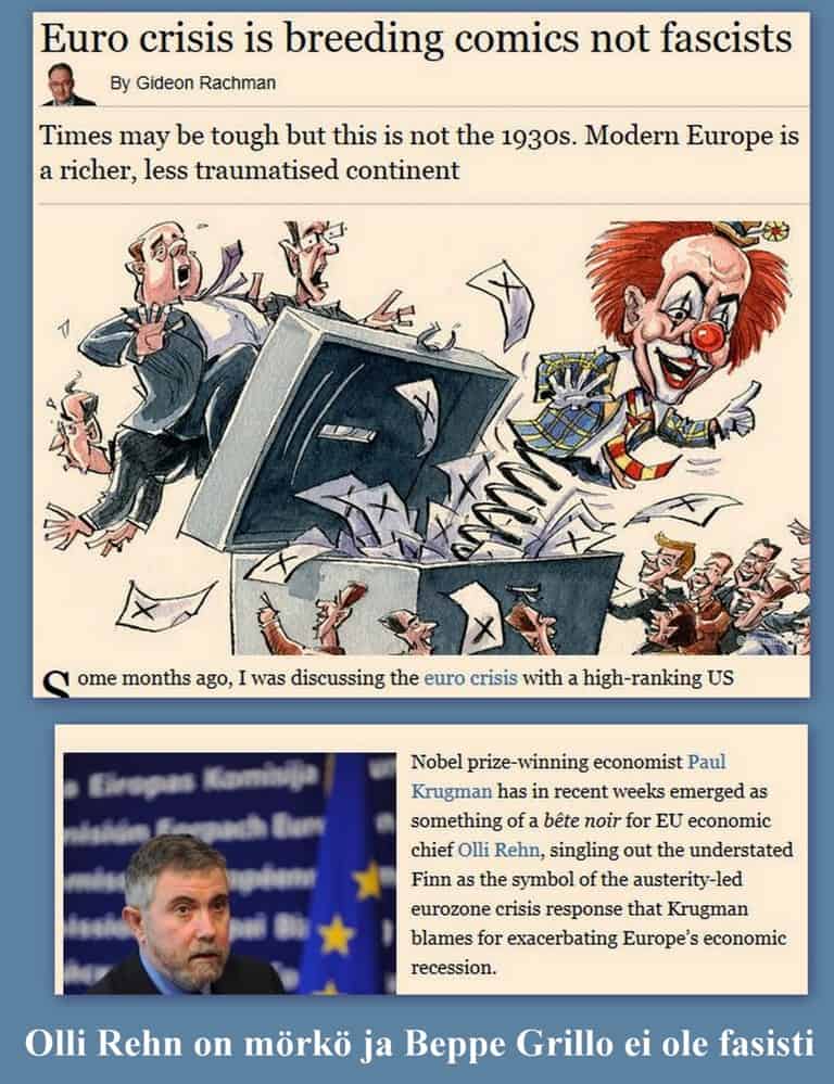 Mahdottomalta mallilta tämä näyttää ja niinpä Gideon Rachmankin, joka ei pidä Beppe Grilloa fasismin tuojana, epäilee kuitenkin, että koomikot viiden vuoden päästä nauravat parhaiten. Kirjoituksia palstalla on referoitu oheisen kuvitukseen  liittyvää  Rachmanin kolumnia.