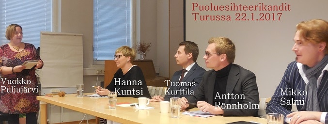 Neljä puoluesihteeriehdokasta esiintyivat Varsinais-Suomen puoluekokousedustajille.
