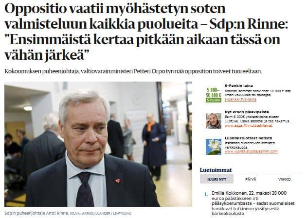 Kun nyt välttämättömyydestä tehtiin happamia pihlajamarjoja katsovan Petteri Orpon sanoin hyve, niin lopultakin Antti Rinne pääsi sanomaan ja näkymään sekä Helsingin että Turun Sanomissa: