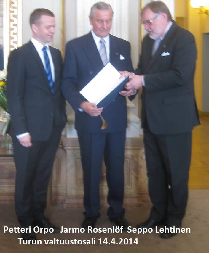 Tasavallan presidentin avoimen kirjeen Turun kaupunginjohtajalta Aleksi Randellilta valtuuston puheenjohtaja Seppo Lehtisen järjestämässä juhlahetkessä Turun valtuustosalissa