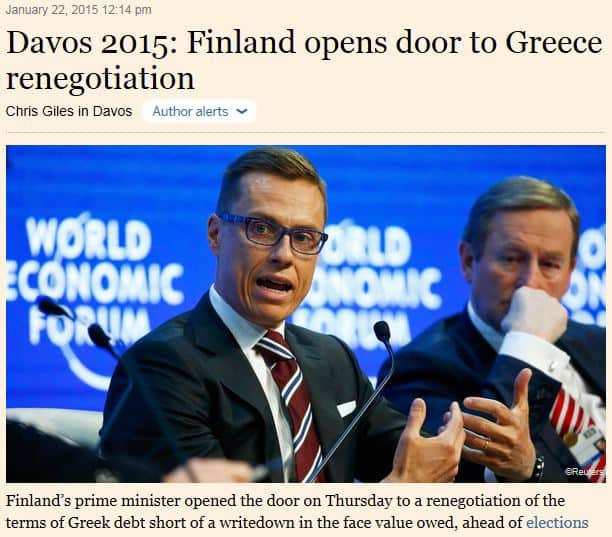 Davosista FT uutisoi, että Suomen kovan linjan on muuttumassa. Suomea on pidetty haukkojen haukkana ja nyt Alex Stubb, jonka edellistä lausuntoa pidettiin Kreikan vaaleihin sekaantumisena, korjasi, että siitä ei ole kysymys.
