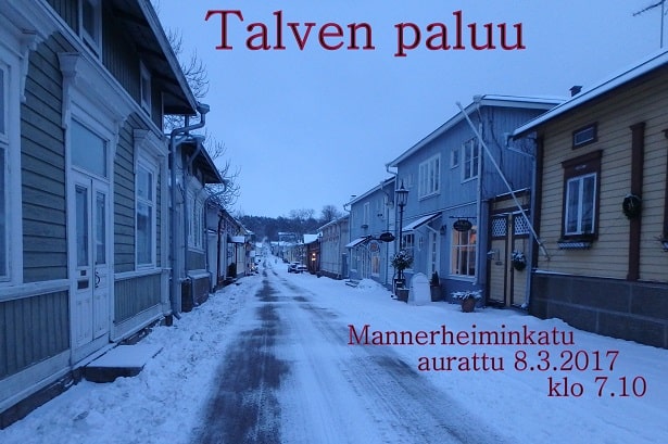Nyt on tapahtunut parannus ja kadulle oli aurattu yksi väylä aamuvarhaisella. Torikadulla ja Kaivokadulla ei aura ollut käynyt ja pöyrällä liikkuminen pehmeässä lumessa on taitolaji.