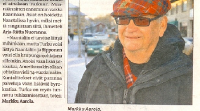 Vakka-Suomem Sanomat pitää paikallislehtikulttuuria yllä kertomalla paikallisista tapahtumista perusteellisesti. Mutta on lehdessä muutakin. Naantalilaisilta kysyttiin Turkkuun liittymisestä. Eihän se kelvannut kenellekään. Mutta luovinta ja keskustelua herättävää oli Naantalin oman kasvatin, komean juristin uran tehneen Barryksi kutsutun ja politiikassakin monessa hommassa mukaana olleen Markku Aarolan heitto: