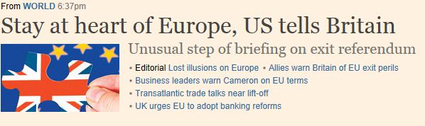 Pääministeri David Cameron on järjestämässä kansanäänestyksen suhteista EU jäsenyyteen. Taustalla on Tory-puolueen sisällä oleva voimakas EU:n vastaisuus ja nämä äänet ovat vahvistuneet. Mielipidemittauksissa EU vastaissuu sen kun kasvaa. Muistammehan, että konservatiivien puoluekokouksessa kuultiin muiden lisäksi myös suomalasta aisaintuntijaa Timo Soinia. Tiedämme myös, että aika usein saarivaltiossa korostetaan transatlanttisia suhteita vaihtoehtona EU- jäsenyydelle. Nyt tuo näkemys poistettiin selvä sanaisesti.