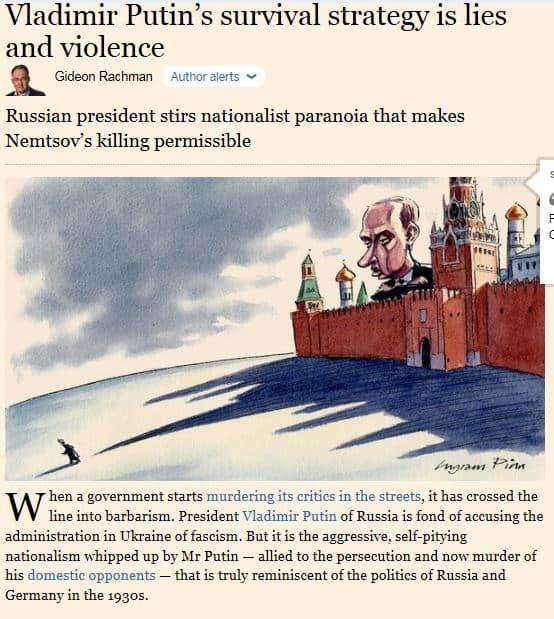 Gideon Rachmanin kolumnissa kerrottiin Boris Nemtsovin pelänneen etukäteen tulevansa ammutuksi. Nemtsov väitti tuovansa julkisuuteen todisteita Venäjän Ukrainan sotaan osallistumisesta. Hän käytti uhkarohkeasti rankkaa kieltä esimerkiksi viimeisessä FT:n haastattelussa: