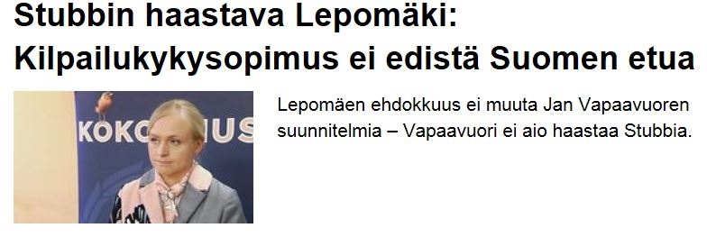 Elina Lepomäki uskoo asiaansa ja mikä vielä tärkempää, näkyvämpää, itseensä. Hänelle tärkeä sana on minä; minä olen kova neuvottelija.