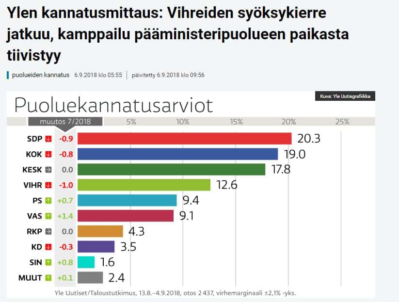 Tässä alempana oli juttu, jossa kerrottiin Euroopan demareiden syöksystä. Jutuun oli liitettu grafiika, jonka johdosta kysyin, mitä johtuu että demarien käyrä päättyy vuoteen 2015. Analyyttinen maisteri päätteli, että se johtuu siitä, ettää meillä ei ole ollut vaaleja. Niinkin osin on, ei ole ollut eduskuntavaaleja sen sijaan meillä oli kuntavaalit 2017 ja Ruotsin laskeva käyrä katkoviivoilla jatkuu tähän vuoteen.