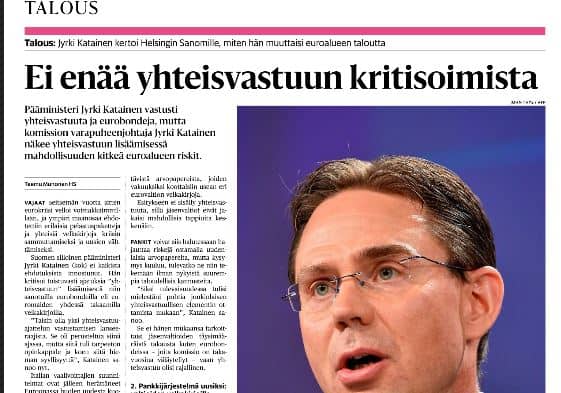 Suomen silloinen pääministeriJyrki Katainen(kok) ei kaikista ehdotuksista innostunut. Hän kritisoi toistuvasti ajatuksia ”yhteisvastuun” lisäämisestä niin sanotuilla eurobondeilla eli euromaiden yhdessä takaamilla velkakirjoilla.