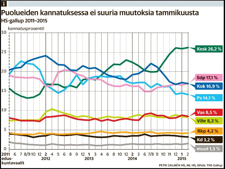 keskusta on säilyttänyt johtoasemansa 26 prosentin kannatuksellaan. Hs 18.2.2015