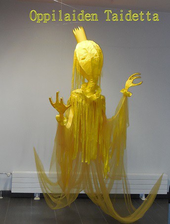 Portaikossa vastaan tulevat oppilaiden taideteokset kohottavat rakennuksen