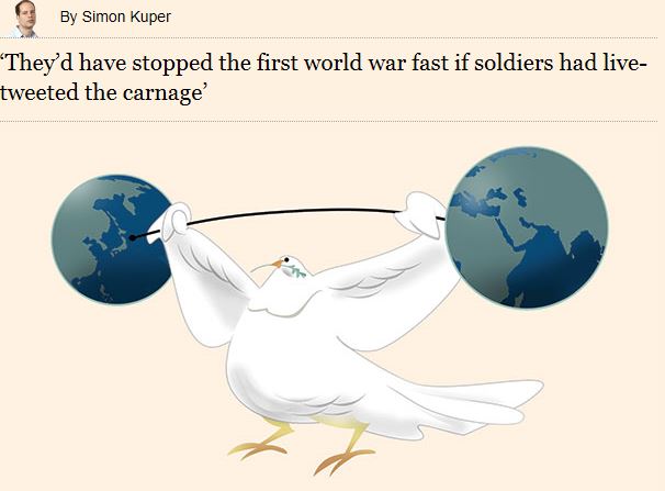 Simon Kupper kirjoitti FT:ssä, että jos Ensimmäisen Maailmansodan sotilaat olisivat päässeet tweettailemaan kärsimyksistään , olisi sota loppunut lyhyeen. Hän usko, ettei maailmansotaan ajautuminen enää nykyisin voisi tapahtua 1914 malliin.