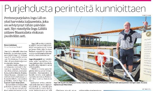 TS teki hyvän työn kertomalla perinnepurjehdusmahdollisuudesta. Luulen, että harvat naantalilaiset tietävät tästä mahdollisuudesta. Syyt ovat yksinkertaisia: Emme näe lähelle emmekä kiinnitä huomiota omiin mahdollisuuksiin yhtäältä ja toisaalta siksi, että Kalaasi Inga-Lill ei ole vanhan kaupungin rannassa, jonne se kuuluisi ja jossa se saisi osakseen luonnollista huomiota. Sataman massiiviseen ympäristöön komea purjealus hukkuu.