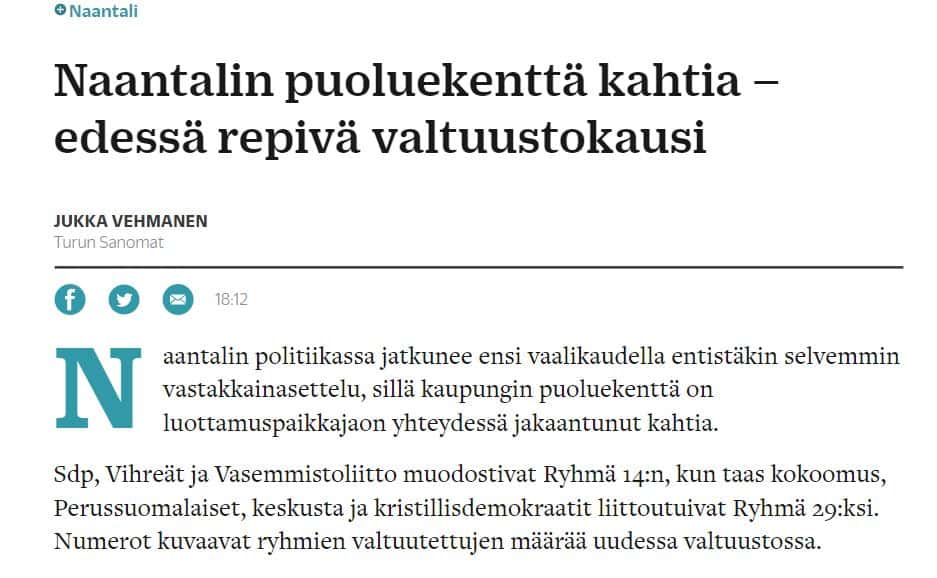 Tavion mukaan jako tarkoittaa sitä, että sekä kaupunginvaltuuston että kaupunginhallituksen puheenjohtajan paikat ovat tulossa Ryhmä 29:lle. Viime valtuustokauden aluksi kokoomus ja Sdp sopivat, että molemmat puolueet saavat valtuuston puheenjohtajuuden kahdeksi vuodeksi. Kokoomuksella oli hallituksen ykköspesti.