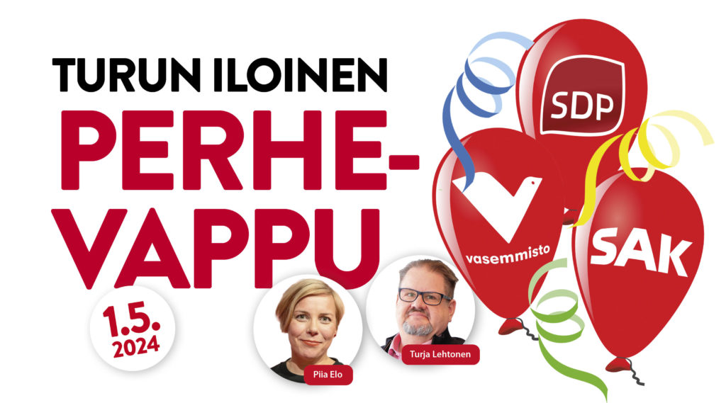 Toivotamme teidät tervetulleiksi osallistumaan Suomen suurimpaan SDP:n omaan vappukulkueeseen ja sen perään järjestettävään Työväen yhteiseen vappujuhlaan 1.5.2024. Juhlapuhujina ovat Piia Elo ja Turja Lehtonen. On tärkeätä näyttää seudun asukkaille joukkovoimaa. Ja osastojenne liput toisivat näyttävyyttä yhteiseen lippulinnaamme. Kulkueeseen sopivat myös poliittista viestiä tuovat banderollit! Järjestäydymme klo 11.30 alkaen Aurajoen rannassa osoitteessa Kristiinankatu 1.