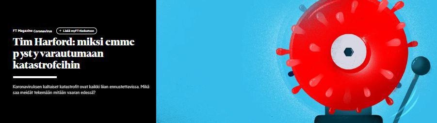Pääsiäisen sanoma johdatteli miettimään ihmisen osaa; pelastuksesta ja kuolemasta jopa maailmanlopustakin kirjoittelin. Ne teemat nostivat sitten riskitarkastelun keskiöön. Ja tänään sitten huomasin, FT:ssä Tim Hardford kirjoittaa riskien tunnistamisesta ja niihin valmistautumisesta.