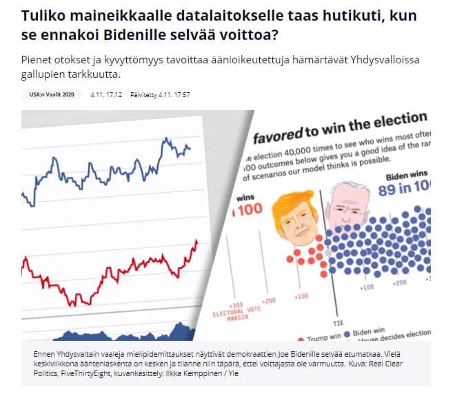 Yhdysvaltalainen media julkaisi vakiintuneina bisnesyhteistyökumppaneinaan toimivien mielipidemittausfirmojen epäluotettavia otantoja, vaikka tälläkin kertaa, kuten jo neljä vuotta sitten, olisi ollut tarjolla pienempien ja kaupallisesti tuntemattomampien mittaajien sosioekonomisesti ja -mentaalisesti analyyttisempiä mittauksia, jotka ennustivat pitkin syksyä loppuun asti äärimmäisen tasaista vaalia. Yhdysvalloissa ilmeisesti ei vain media, vaan tutkimuslaitokset ja -firmat ovat myös poliittisia osallistujia, toisin kuin vapaassa lännessä, mikä käsite taitaa tarkoittaa lopulta vain muutamaa eurooppalaista maata pohjoismaiden lisäksi. Yhdysvaltojen radikaalilla kahtiajakautumisella on päivänselvä valtakulttuurinen tausta, joka asettaa ennen kaikkea median ja valtaapitävän yhteiskuntaeliitin tämän jälkeen todella kriittiseen valoon, voittaapa vaalit kumpi ehdokas hyvänsä. Yhdysvaltojen valtamedia toitotti maanantaina yhteistyökumppaneinaan toimivien mielipidemittaajien ”tietoa”: Biden voittaa 97-prosenttisellatodennäköisyydellä. Jokainen tietää, että se on tällaisissa tutkimuskohteissa ilmaisu satasen varmuudesta ylivoimaisesta voitosta. Hyvää koulutusta johtavalle Suomi-mediallekin, Ylelle ja Hesarille, joka on elänyt tässä, hieman karrikoiden, virallisessa valemediassa täysin palkein mukana