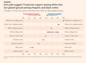 Mielenkiinnolla taustoja tutkitaan ja mietitään Kuten Martin Sandbu: Valkoiset duunarit vähensoivät kannatustaan ja mustat lissäsivät jne kertoo ovensuukyselyjen tulos.