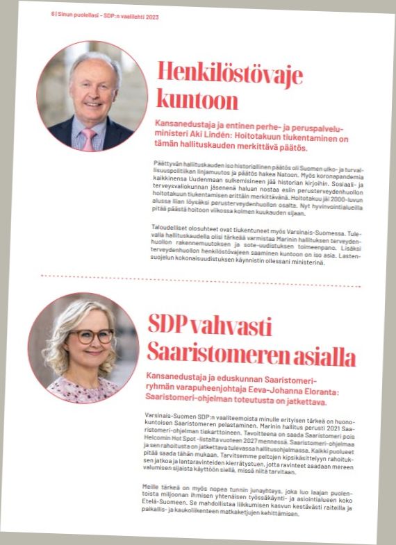 | SDP julkaisee eduskuntavaalien alla jokaisessa vaalipiirissä vaalilehden, joka jaellaan kotitalouksiin mainosjakelun mukana. Vaalilehdestä löydät mm. puheenjohtaja Sanna Marinin haastattelun, SDP:n tärkeimmät vaalitavoitteet sekä tietysti oman alueesi eduskuntavaaliehdokkaiden esittelyt.