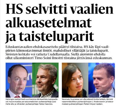 Hesarin etusivuilla Orpo ja Andersson ja Halla-aho ja Haavisto.