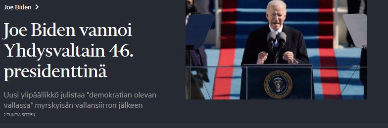 Joe Biden tervehti Yhdysvaltojen demokratian sietokykyä ja pyysi yhtenäisyyttä polarisoituneessa kansakunnassa, kun hänet vannottiin 46. presidenttinä ja saatettiin päätökseen myrskyisä vallansiirto, jonka tuhosi tappava hyökkäys Capitoliin. Keskiviikkona iltapäivällä pitämässään avajaispuheenvuorossa Biden ei maininnut Donald Trumpia nimeltä, mutta sanoi, että maan poliittisen järjestelmän perusta oli testattu hänen edeltäjänsä kieltäytyessä myöntämästä tappiota. ”Olemme jälleen oppineet, että demokratia on arvokasta, demokratia on hauras, ja tällä hetkellä ystäväni, demokratia on voittanut”,