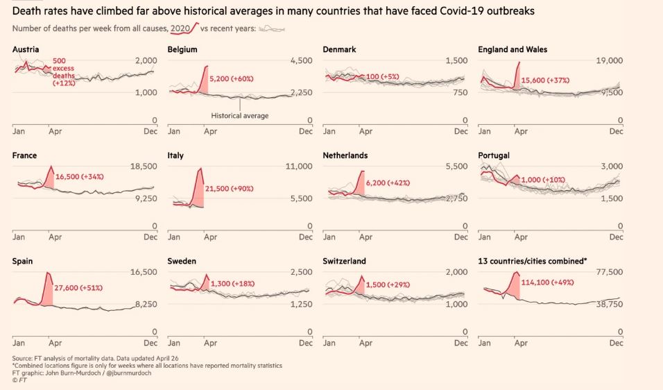 FT-analyysin mukaan pandemian aikana kuolonuhrien kokonaismäärä kasvoi 60 prosenttia Belgiassa, 51 prosenttia Espanjassa, 42 prosenttia Alankomaissa ja 34 prosenttia Ranskassa verrattuna edellisen vuoden vastaavaan ajanjaksoon.