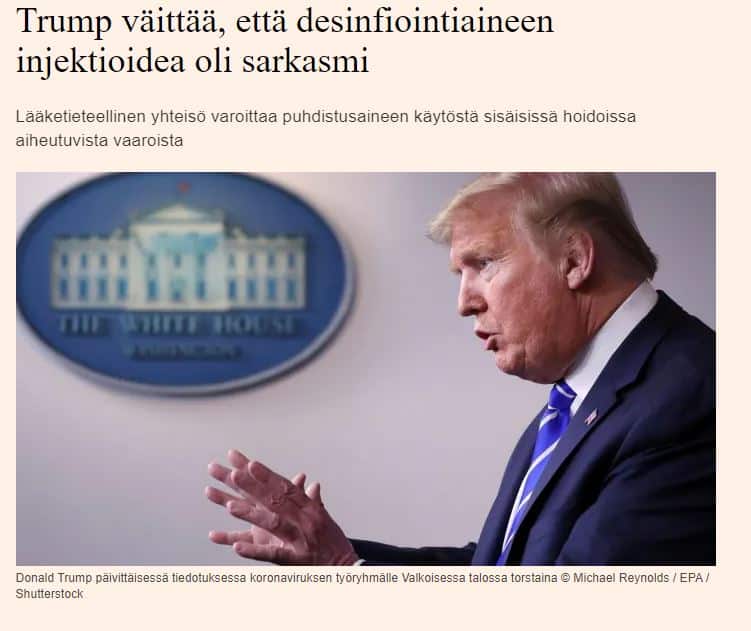 Donald Trump väitti, että puhdistusaineidensa testaamista oli sarkastinen kommentti, jonka tarkoituksena oli provosoida toimittajia. Hän väitti, että hän tiesi, että desinfiointiaineita tulisi käyttää vain ihon puhdistamiseen.