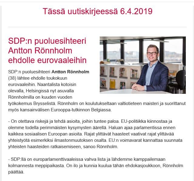 SDP:n Varsinais-Suomen piirikokous, kuten tällä palstalla kerrottiin, pyysi puoluesihteeri Antton Rönnholmia asettumaan Euroopan Parlamentin vaaleihin ehdolle. Kättä tämän puolesta nostettiin reippaasti taputusten kera.