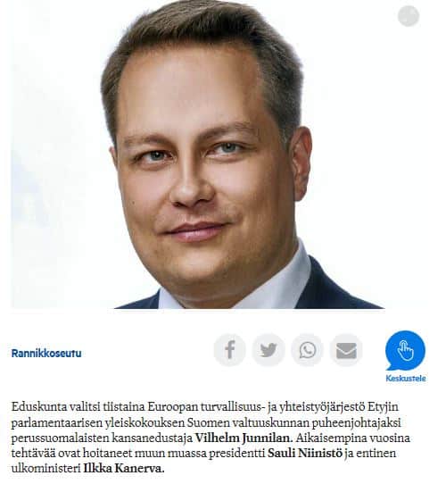 Vilhelm Junnila on saanut vastuullisia tehtäviä varmaan enemmän kuin kukaan muu ensimmäisen kauden edustaja. Arvostettu ETYJ valtuuskunnan puheenjohtajauus, Pohjoismaiden Neuvosto viittaavat kansainvälisyyteen ja valtionvarain valiokunta talouteen. Onnittelemme rohkeista valinnoista; kansallismielisen, pakko Ruotsia vastustavan puolueen edustaja osoittaa laajakatseisuutta näillä valinnoilla.