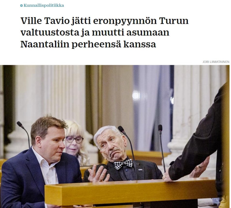 TS:n verkkosivuilta (kuvakaappaus sieltä) saatiin lukea, että Ville Tavio pyytää eroa Turun valtuustosta paikkakunnalta poismuuton vuoksi.