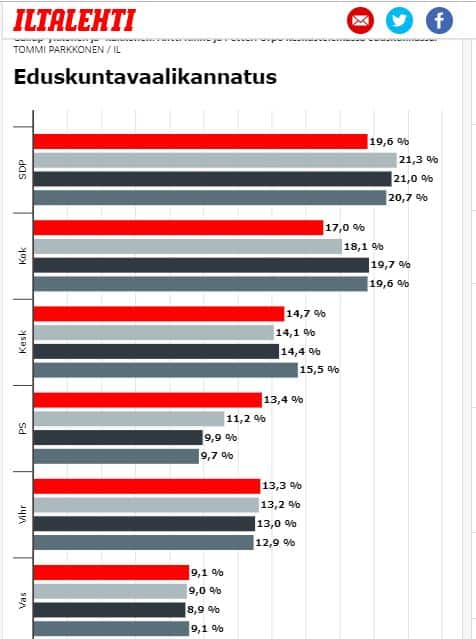 Alma Median gallupissa SDP:llä merkittävää pudotusta verrattuna Alman edelliseen tutkimukseen, mutta Ylen tutkimusta -0,4 prosenttia eli alla 20 prosentin pudottiin . Suuntaukset ovat edellisen Ylen mukaisia, joten selvältä näyttää, että viimeinen viikko ratkaisee. Ratkaisu ei ole telkkarikatsomossa vaan kadulla kansan keskuudessa.