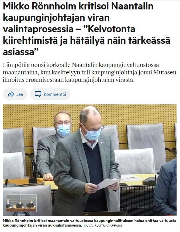 Mikko Rönnholmin tulkinnan mukaan kaupunginhallitus on kiirehtinyt hakuprosessia ja samalla on unohdettu kaupunginvaltuusto. Rönnholm totesi, että Jouni Mutasen eroilmoitus tuli tiedoksi merkittävänä asiana valtuustolle vasta sen jälkeen kun Hannu Aalto (sd) oli lukenut kaupunginhallituksen jäsenille ja virkamiehille hallintosääntöä.