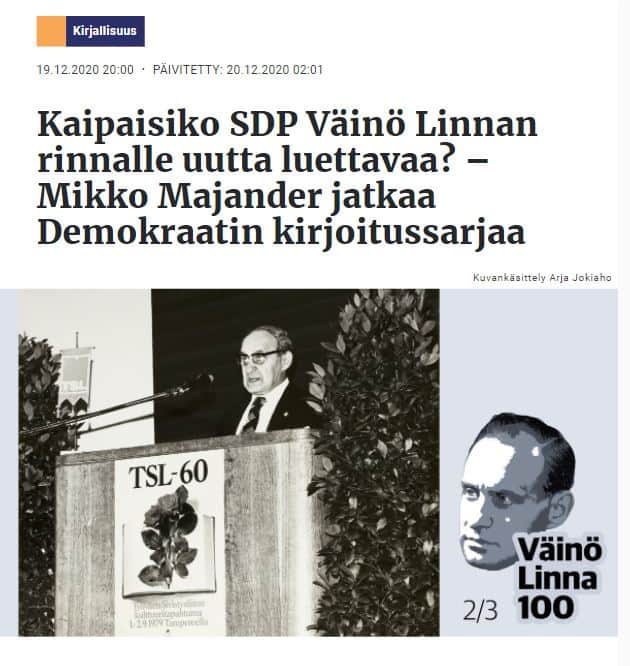 Siksi ajankohtaisempi on Historioitsija Mikko Majanderin esseen otsikkokysymys: ”Kaipaisiko SDP Väinö Linnan rinnalle uutta luettavaa”