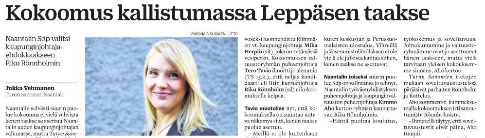 Laura Leppänen ilmoittaa olevansa sitoutumaton, joten kun Tavio on hänet hyväksymässä hän ei ole siis sosialisti eikä edes vasemmistolainen. Hän on tunnetusti ollut kuvassakin mainitun Varsinais-Suomen liiton puheenjohtaja Ilkka Kanervan, kok ja maakuntajohtaja Kari Häkämiehen, kok suosikki. Tiettävästi häntä on Naantaliin pyydetty ilmoittautumaan kokoomuslaisten toimesta. Miksi sitten kokoomulaiset tarjoavat häntä perussuomalaislle ja keskustalle oman miehen eli Lauri Katteuksen sijasta?