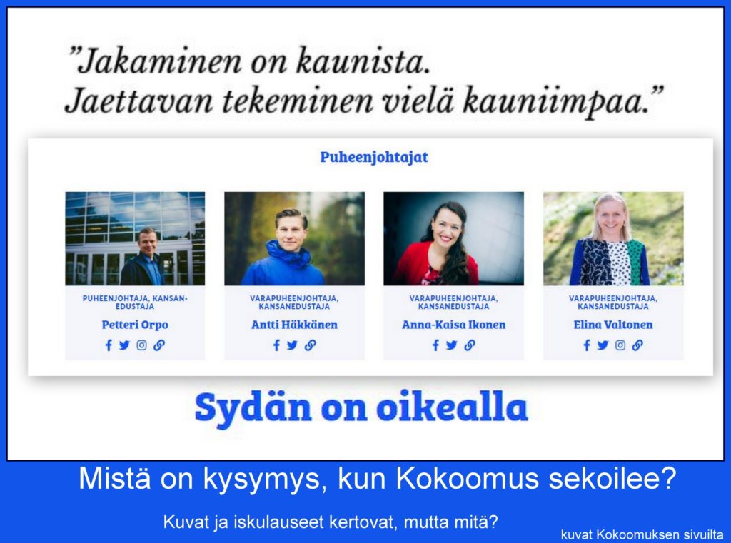 Tämä oli arvokas teko demokratialle: Se paljasti, että Kokoomuksen sydän on milloin missäkin ja mielikuvilla leikitellään muutoinkin; meillä on kivaa hengessä. Mutta vastuullisuus ja isänmaan asia ovat pelkkiä kliseitä, jotka joutava syrjään politiikan pelin niin vaatiessa.