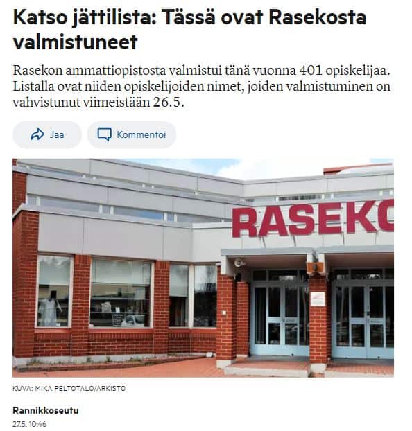 Mutta kyllä suru on puserossa kun lopullisesti olemme menettäneet muun toisen asteen opetuksen. Rasekosta valmistuu 400 kuten lehdet ovat kertoneet. Mutta huolimatta siitä, että Rasekoon aikoinaan liitettiin Naantalista Emäntäkoulun perillinen ja huolimatta siitä, että Naantalissa on matkailupalveluja niin meiltä vietiin säästösyistä kaikki, vaikka olimme investoineat rakennuksiin ja mahdollisuuksiin.