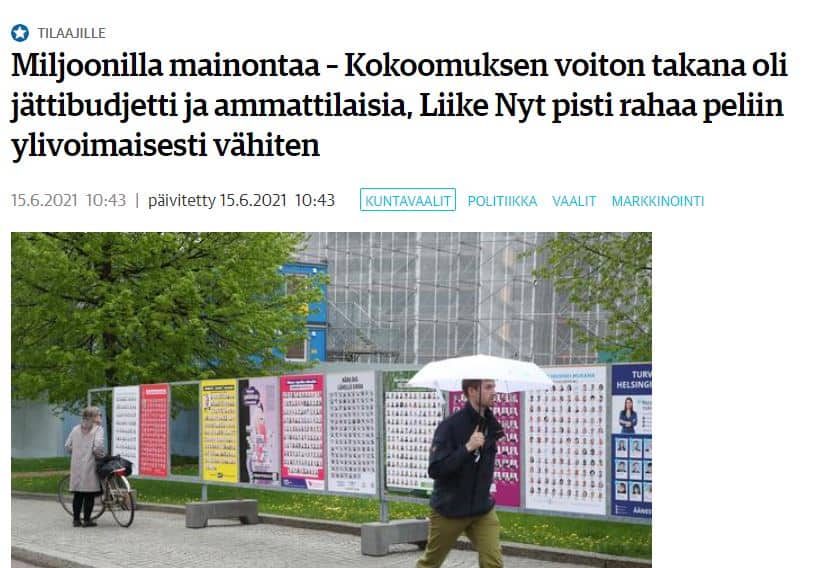 Strategiseksi onnistumiseksi Nieminen nostaa kokoomuksen kampanjan, koska sitä ei rakennettu ”värittömän ja hajuttoman” puheenjohtaja Petteri Orpon varaan, vaan tv-mainoksissa näkyvämmin esillä olivat puolueen muut ehdokkaat. KL 15.6.2021