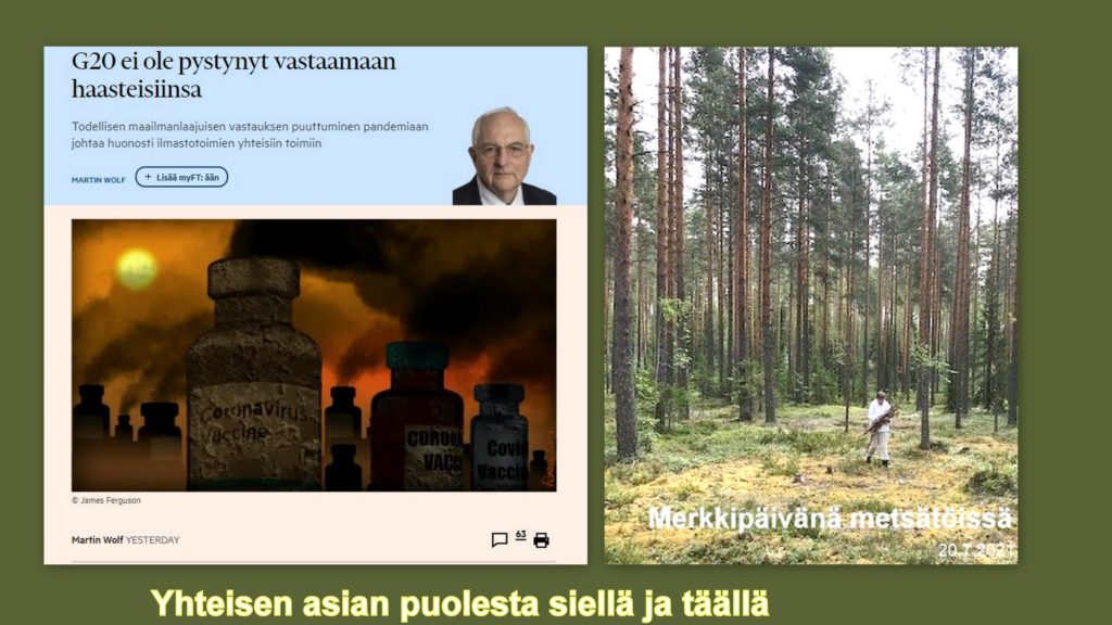 Hän päättä kolumninsa pettyneenä G 20 aikaansaannoksiin. Verotuksessa saavutettu yksimielisyys oli hyvä saavutus, mutta pientä verrattuna siihen, että nämä G20 maatta, joiden asukasmäärä ovat 63 prosenttia maailman ihmisistä ja joiden tuotanto on 87 prosenttia tuotannosta, eivät onnistuneet löytämään koronaan ratkaisuja, vaikka ne ovat selkeästi taloudellisesti perusteltuja. Näiden maailman tehokkaimpien maiden velvollisuus olisi ratkaista asiat, sillä niillä olisi parhaat mahdollisuutemme globaalille taloushallinnolle. Mutta pandemian itsekäs hoito viittaa siihen, että paljon vaikeampaan ilmastokysymykseen ei ole odotettavissa – ikävä kyllä – hyviä tuloksia.