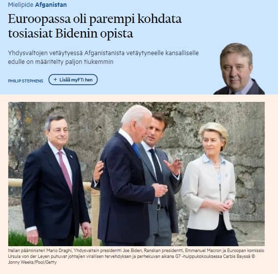 Eurooppalaiset osoittavat närkästystään ja kertovat pettyneensä Joe Bidenin lupauksiin :” Amerikka on takaisin”. FT:ssä Philip Stephens analysoi kolumnissaan, että eihän tämä ollut mikään yllätys. eurooppalaisten olisi ollut aihetta miettiä asenteitaan ja valmiuksiaan ja koko Afganistanin tilannetta silloin, kun talibanin suistiin jenkkien koston varmistamiseksi vallasta 1.9.2001 iskujen jälkeen.