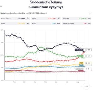 Tähän on omat syynsä ja syyt ovat ehdokkaat. CDU:n kansleriehdokas on nauranut väärässä paikassa ja vihreiden ehdokkaalla on tutkinto epäselvyyksiä. Näitä syistä ehkä liioitellaan. Ehkäpä on vain niin , että Sosialidemokraattien  Olaf Scholz valtionvarainministeri on luotettava ja hänellä on näyttöä Hampurin johtamisesta. Kansakunta ei halua ottaa riskiä, mutta kääntyykö pitkään jatkunut sosialidemokraattien alamäki riippuu saksalaista – tietenkin.