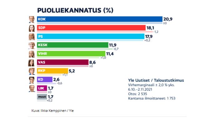 SDP:n kannatuksen lasku osuu ajalle, jolloin pääministeri Sanna Marin oli keskellä kiistelyä Veikkauksen rahoista ja julkisuuteen levisivät kuvat juhlista Kesärannassa. Yle 4.11.2021