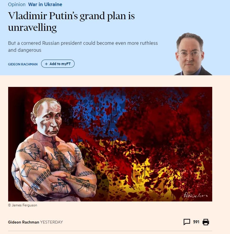 Suuri suunnitelma näyttää purkautuvan ja Vladimir Putin on nurkkaan ahdistettu. Rachman arvelee, että hänellä ei ole lähipiiriä, joka uskaltaisi tehdä palatsivallankumousta. Tilanne on siis jopa neuvostoaikaa hankalampi. ja hän viittaakin Neuvostoliiton edeltäneisiin tsaareihin. Rachman lopettaa pienen toiveen mahdollisuuteen uhan varjostaessa.
