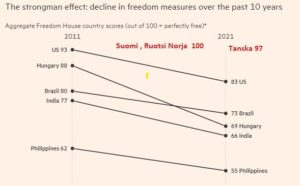 Vaikea ulkopuolisen ymmärtää ja erittäin vaikea EU maasta katsottuna hyväksyä. Unkarin demokratiakehitys on pudonnut viimeisen kymmenen vuoden aikana 19 pinnaa.